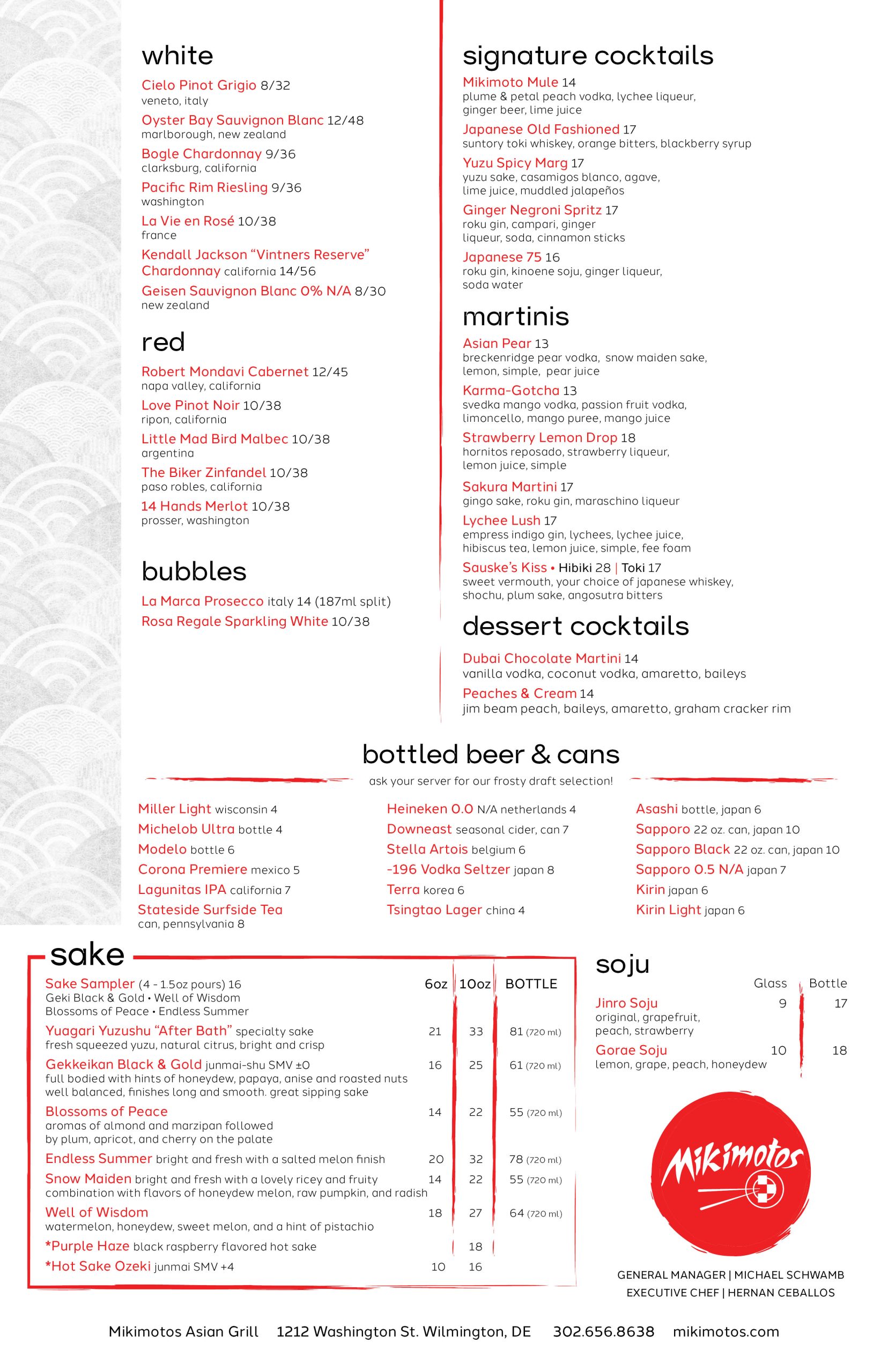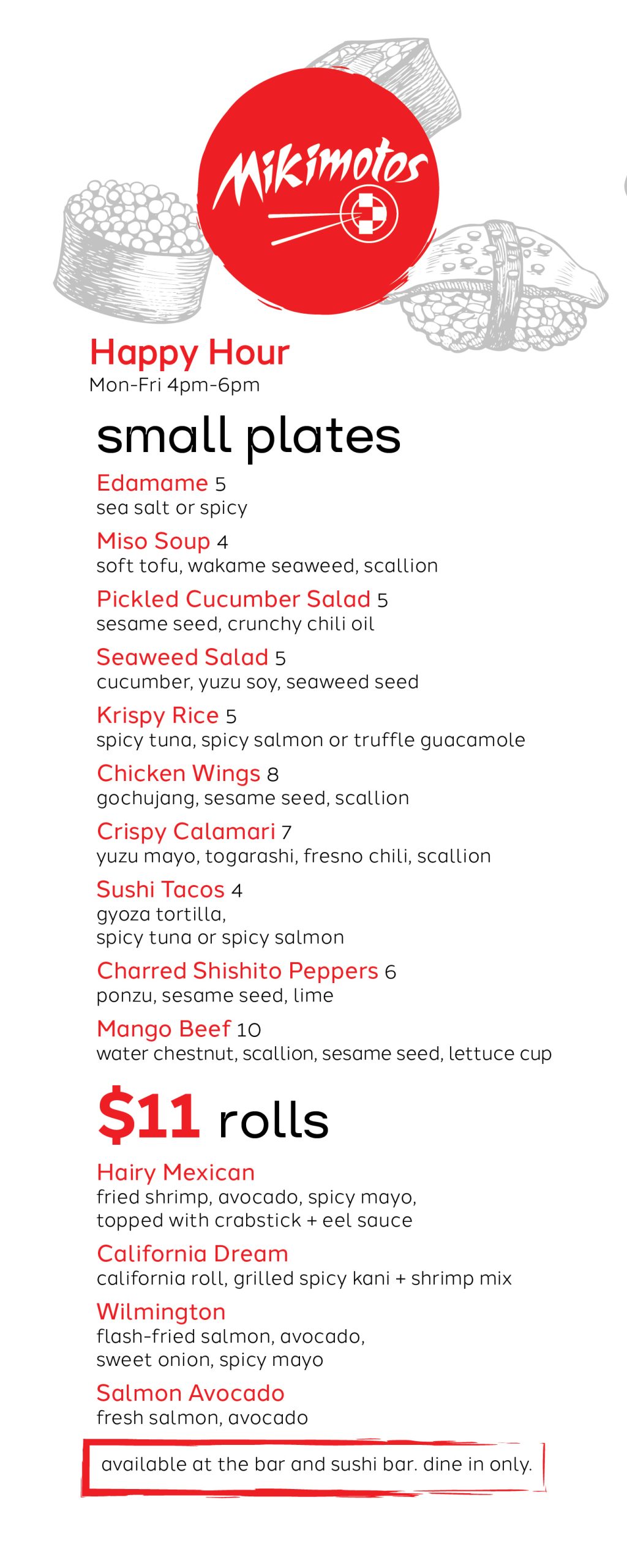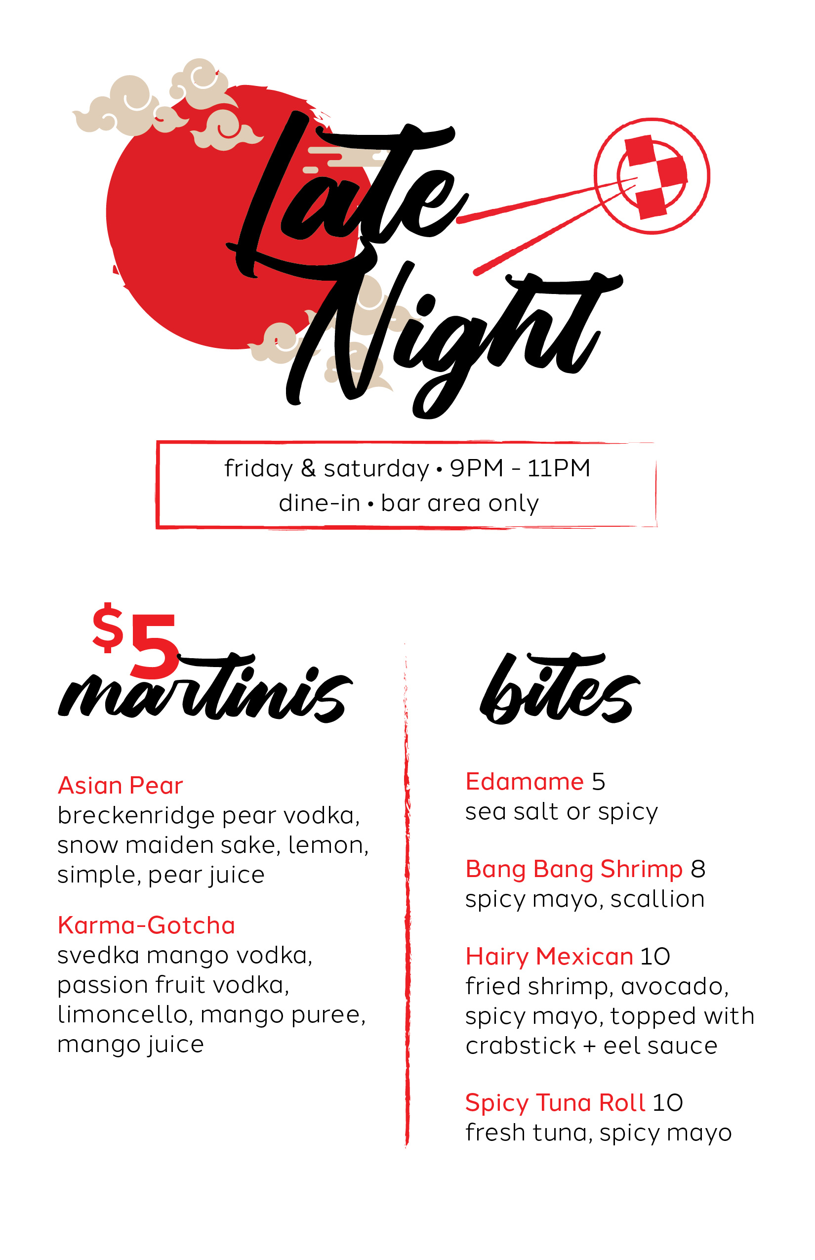 Menu Beverages Happy Hour Monday – Friday 4pm – 6pmAt the bar & bar area Late Night Friday & Saturday 9pm – 11pmAt the bar & bar area